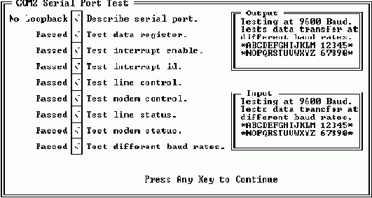 Если к разъему проверяемого COM-порта подключена заглушка, нажмите клавишу <Enter>. В противном случае нажмите сначала клавишу <N>, а затем клавишу <Enter>. Начнется процесс проверки COM-порта (см. рис. 5.16). Если проверка порта завершится успешно, напротив названия каждого теста будет стоять символ